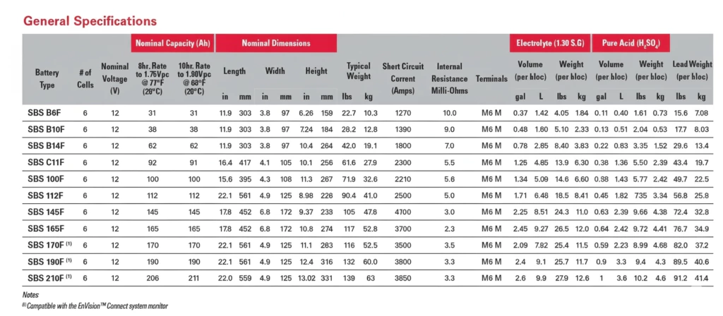 La gama de baterías PowerSafe® SBS Front Terminal abarca capacidades de 31Ah a 190Ah. Todos los modelos listados en la tabla de especificaciones son configuraciones de 12V y 6 celdas.